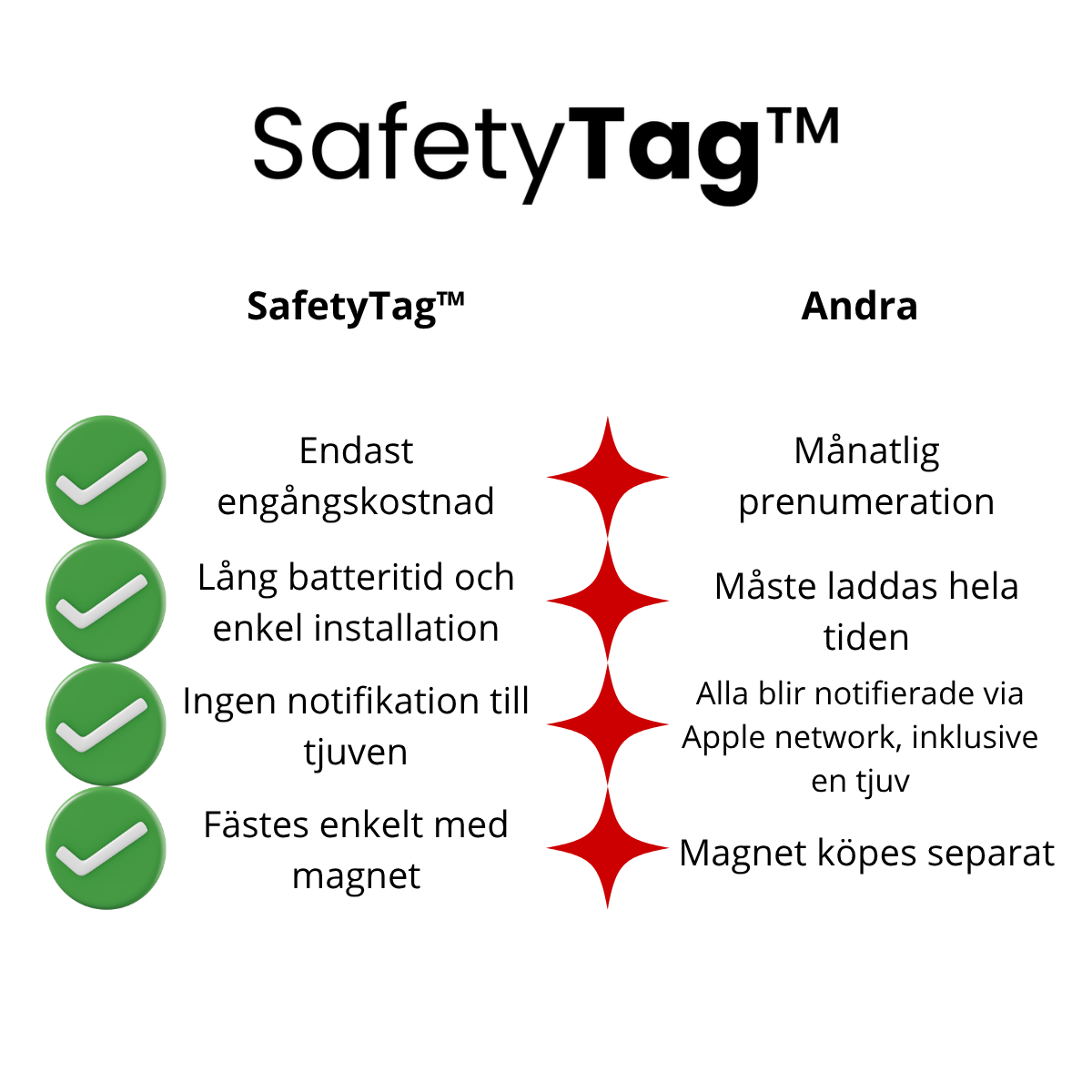 SafetyTag™ är en liten, kompakt spårningsenhet som hjälper dig att alltid ha koll på dina värdefulla ägodelar direkt i mobilen – utan abonnemang.